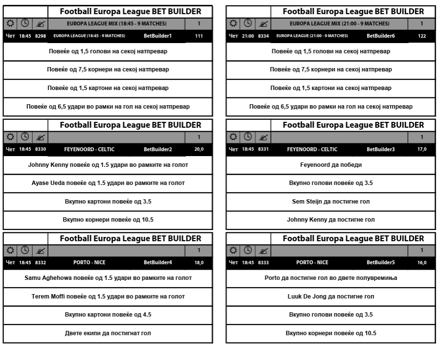 Денешната Бет билдер понуда на Sport Life е составена од десет различни комбинации, а за дневните миксови од Лигата на Европа квотите се над 100.0.