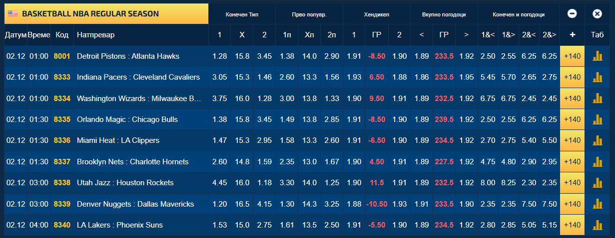 Многу возбудувања се очекуваат вечерва во НБА-лигата, каде што на програмата се девет натпревари. Интересно е дека дури на четири средби квотата за фаворизираниот тим е помала од 1.30, што значи дека има голема шанса да победи. Овие мечеви кои со обложувачки речник се нарекуваат „сигурици“ најавуваат победи на Детроит и Денвер на домашен терен, а на гости да се радуваат Милвоки и Хјустон.