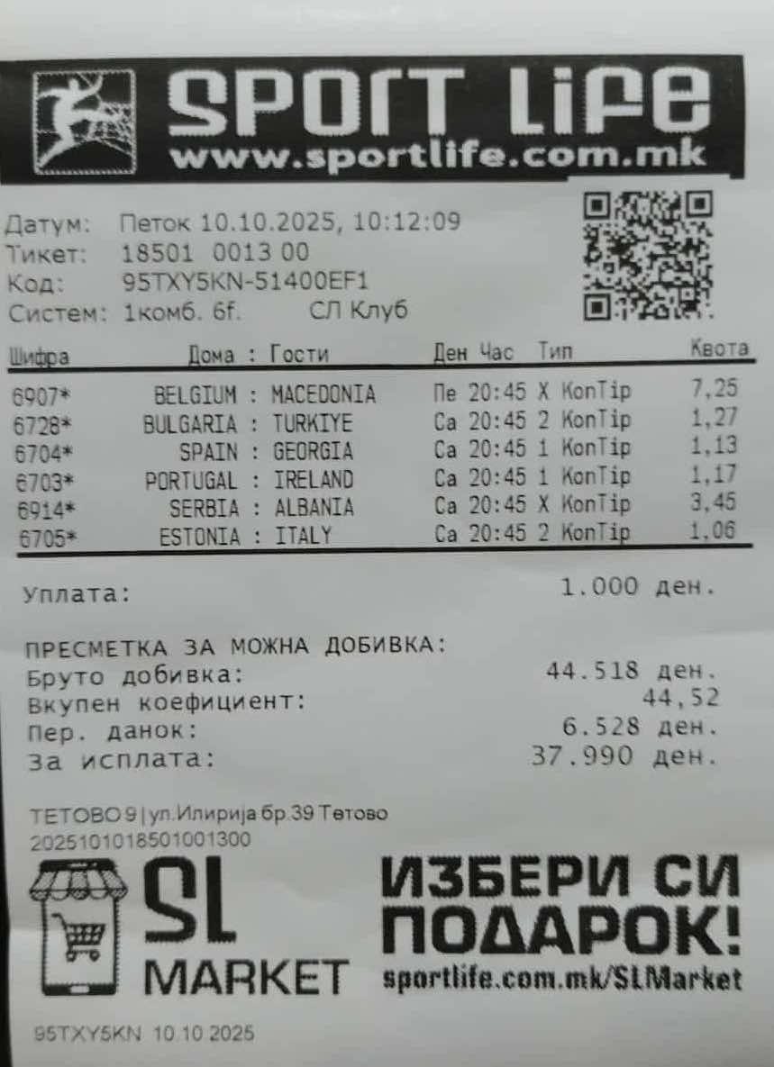 „Фудбал повеќе следам резултатски отколку да гледам 90 минути на телевизија. Имам омилени клубови во секоја лига, како и омилени фудбалери. Во домашното првенство навивам за Вардар, секако, а би ги издвоил Барселона и Наполи од странските лиги. На прсти се брои колкупати сум се обложувал, но сакам да предвидувам и да пробувам да погодам исход од некој натпревар. Марфи секогаш работи на чуден начин, без уплатен тикет погодувам, со уплатен не. Верувам дека нема да изгубиме од Белгија, затоа типував на реми“, заклучува Димитровски, а и ние посакуваме тикетот да биде добитен и парите од добивката да завршат во хуманитарни цели, каде што се потребни.