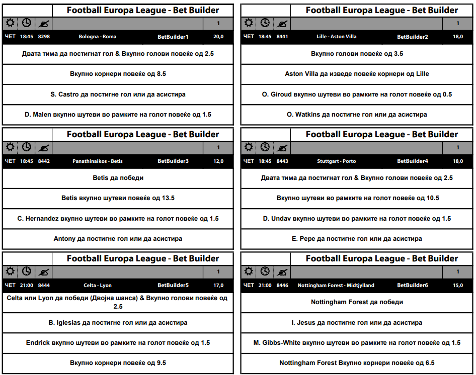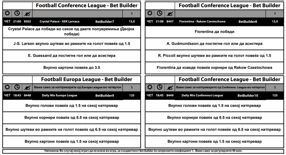 Најпримамливо делуваат миксовите за сите натпревари. Дури 125 коефициент се нуди за миксот во Лигата на Европа, а потребно е: да има над 1,5 голови на секој меч, над 6,5 корнери на секој меч, над 6,5 шутеви во рамките на голот на секој меч, над 1,5 картони на секој меч. Истата комбинација и истиот коефицинет е и за дуелите од Конференциска лига на УЕФА.