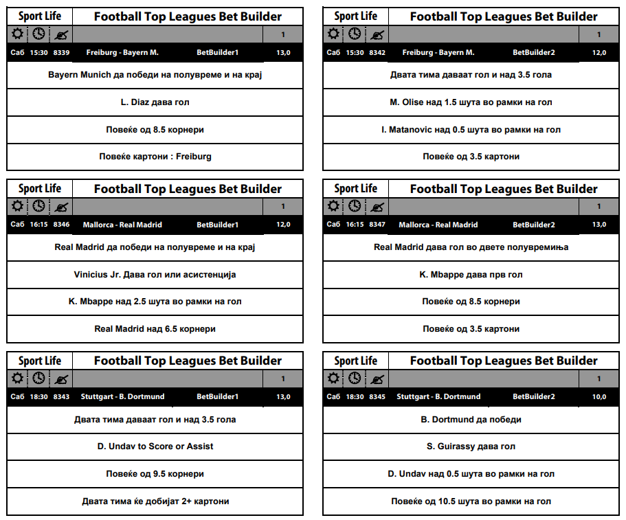 Со 13 коефициент има и билдерска понуда за Мајорка – Реал Мадрид, а да биде добитна потребно е: Реал Мадрид да даде гол во двете полувремиња, Мбапе да биде стрелец на првиот гол, да има повеќе од 8,5 корнери и да има повеќе од 3,5 картони.