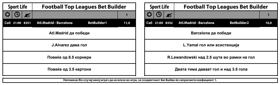 Секогаш посебен предизвик се понудите во Бет Билдер на Sport Life каде има големи коефициенти за неколку интересни дуели.