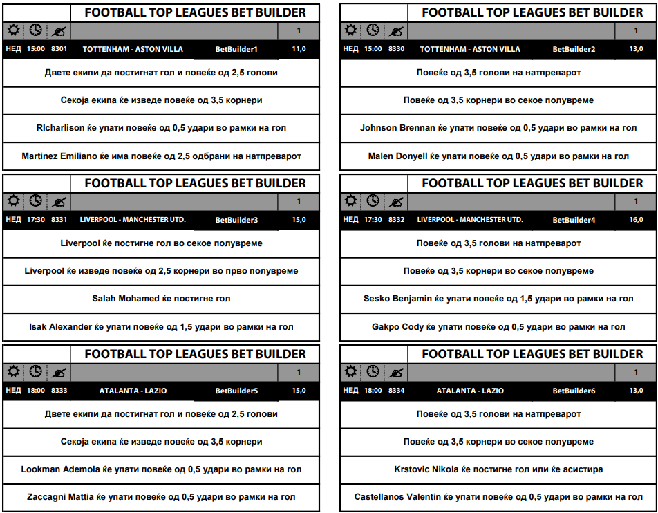 Пет суператрактивни дуели од првенствата во Италија, Англија и Шпанија се дел од Бет билдер пондуата, каде може да се најдат џиновски коефициенти. Вкупно 10 интересни Бет билдер комбинации се понудени, а возбудувањата ќе започнат со мечот меѓу Тотенхем и Астон вила, каде квота од 13 ќе биде добитна ако: има над 3,5 голови на мечот, има над 3,5 корнери во двете полувремиња, Џонсон Бренан има барем еден шут во рамките на голот и Мален Донел има барем еден шут во рамките на голот.