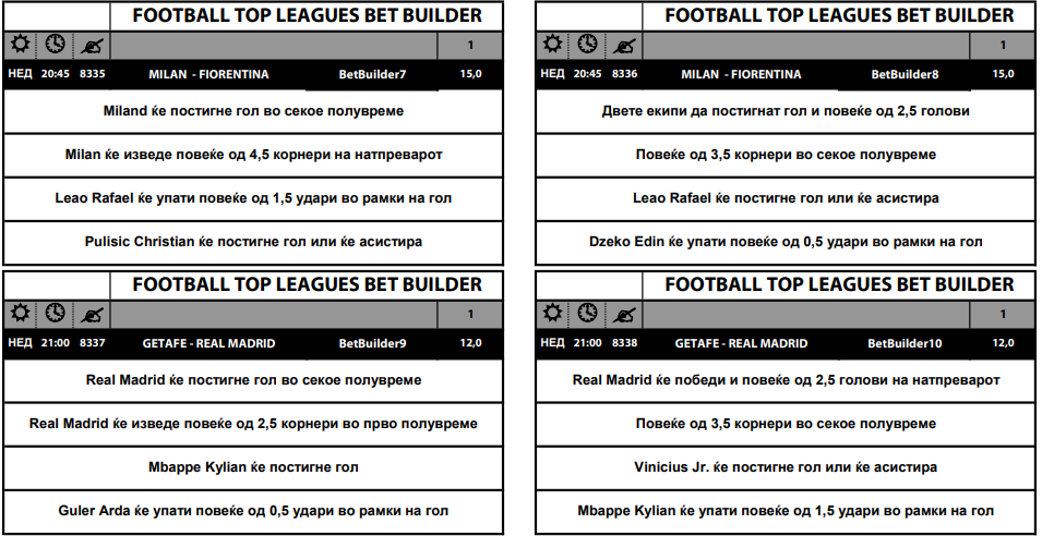 За мечот од шпанската лига меѓу Хетафе и Реал Мадрид има две Бет билдер комбинации и двете се со 12 коефициент. За една од нив да е добитна потребно е: Реал Мадрид да даде гол во двете полувремиња, Реал Мадрид да изведе над 2,5 корнери во првиот дел, Килијан Мбапе да постигне гол и Арда Ѓулер да има барем еден шут во рамките на голот.