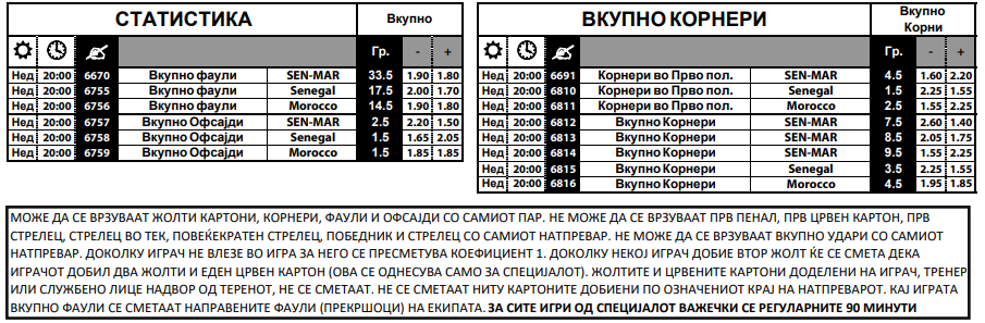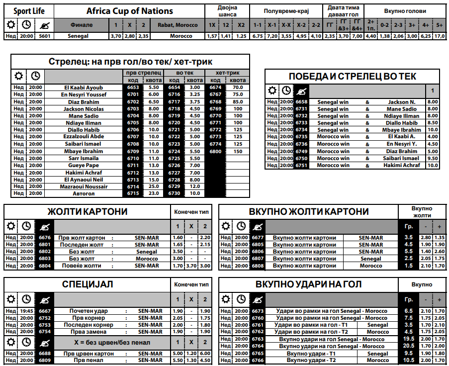 За ова специјално финале има и специјална понуда. Брахим Дијаз е творецот на успехот на Мароко и постигнуваше гол на сите досегашни мечеви од овој турнир. Сега Дијаз да биде стрелец на првиот гол во финалето е со квота од 6.50, а да даде гол во тек на меч е 3.75. За Садио Мане да постигне гол во финалето, коефициентот е 4.50.
