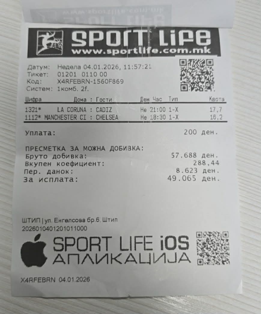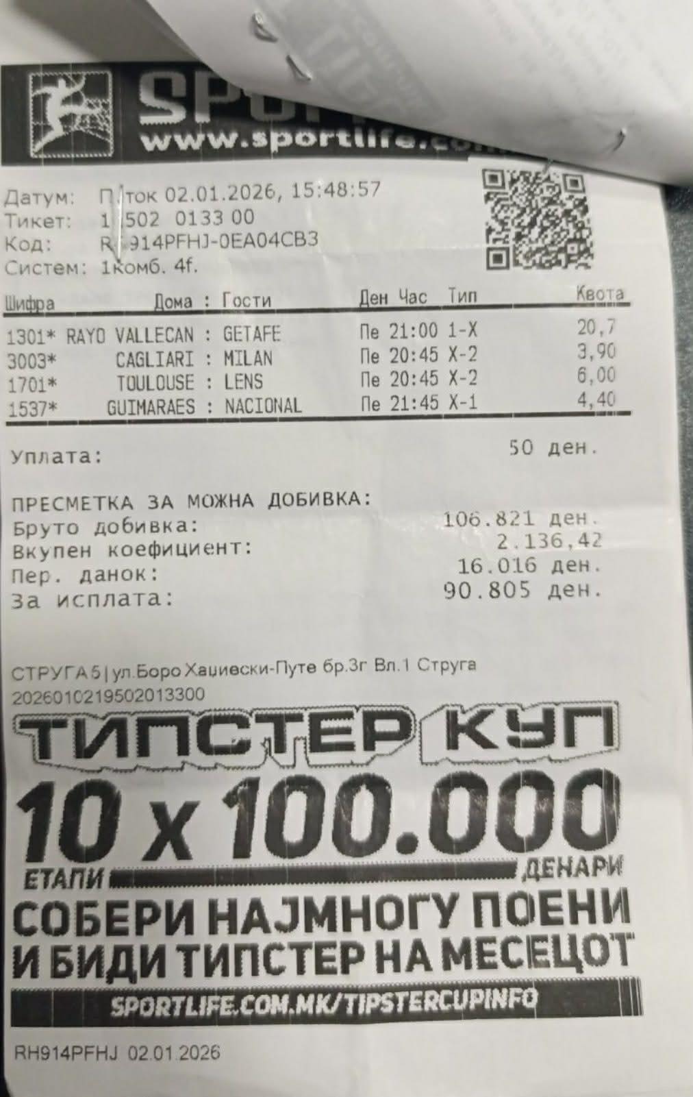 Во Струга беа одиграни четири меча и со уплата од само 50 денари, играчот дојде до нето добивка од 90.805 денари. Квотите на добитниот тикет се движеа помеѓу 3.90 и 20.70.