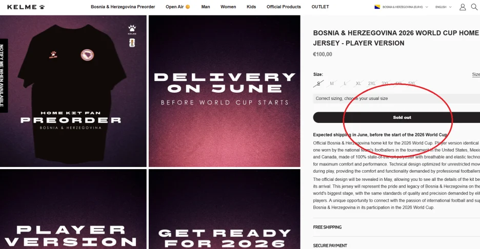 На официјалната веб-страница на Келме, кога ќе влезете во делот со дресови од Светското првенство во БиХ, пишува „распродадено“, што значи дека сите се распродадени во сите големини.