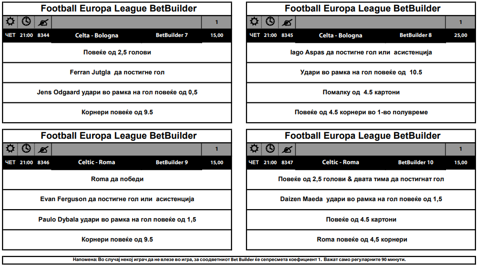 Во Лигата на Европа се играат многу интересни мечеви, а за пет од нив има по две Бет билдерски комбинации, каде што коефициентите се движат меѓу 15 и 25. Не ретко се случува некоја од комбинациите да е добитна, а, секако, овие понуди даваат дополнителна возбуда за гледање на самиот натпревар.