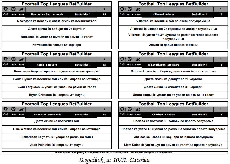 Од поединечните Бет билдери, понуди има за дуелите меѓу: Њукасл – Борнмут, Рома – Сасуоло и Тотенхем – Астон вила, а сите комбинации ги има во понудата на Sport Life.