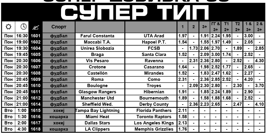 Разновидна и примамлива е денешната Супер тип понуда на Sport Life во која има зголемени квоти за 16 натпревари, од кои 12 се фудбалски, а по два кошаркарски од НБА и хокејски од НХЛ-лигата.
