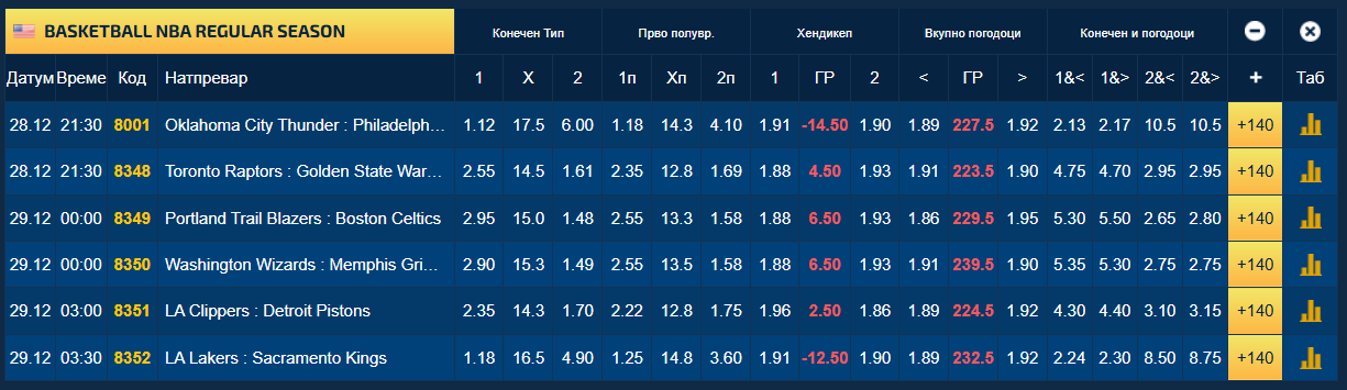 Во НБА лигата се играат шест натпревари, а интересно е дека само на два од нив, домаќините се во улога на фаворити, барем според понудените коефицинети. Во вечерниот термин од 21:30 часот, шампионот Оклахома игра против Фоладелфија и ќе биде чудо ако домаќините не победат.