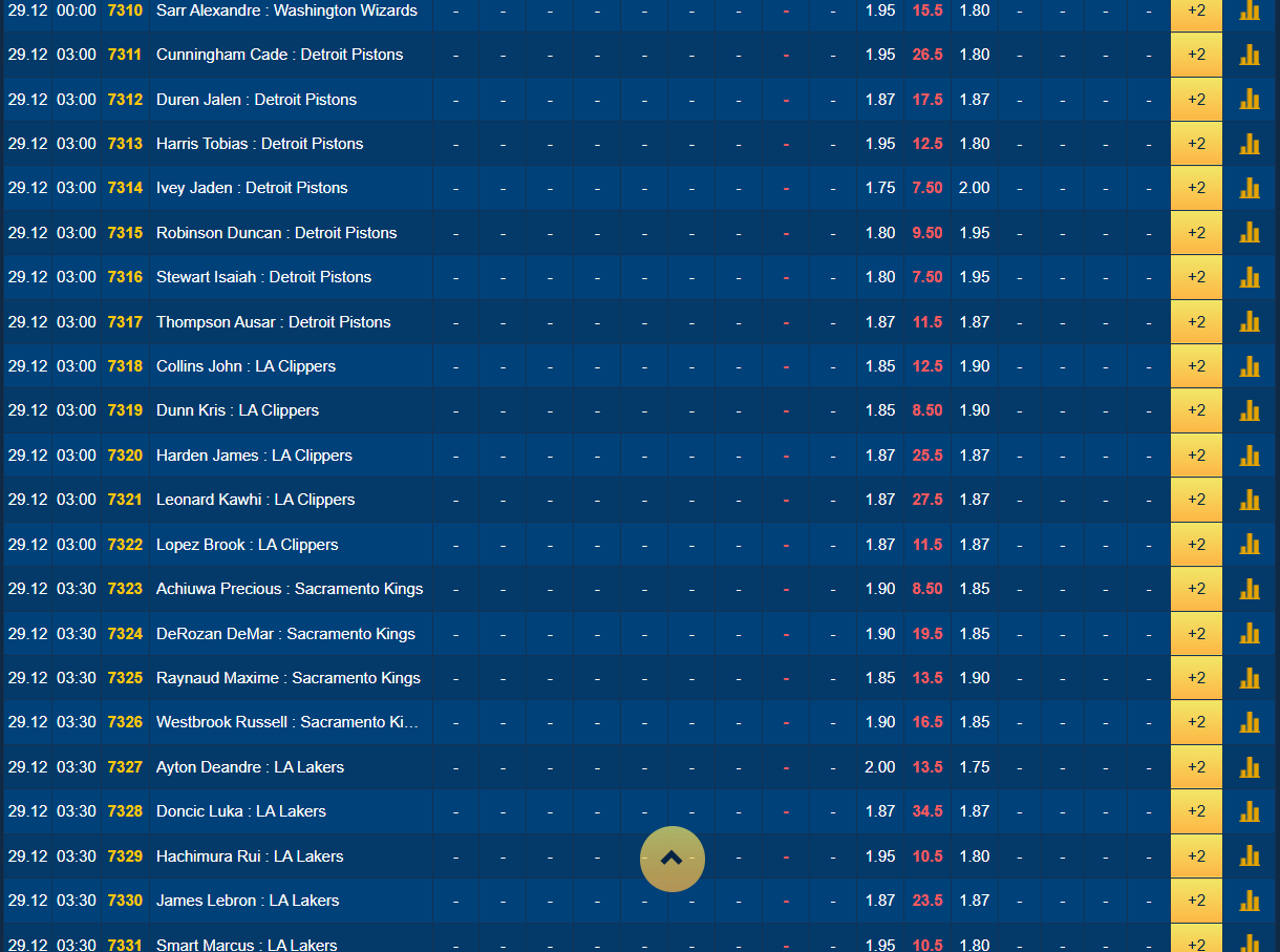 Во понудата за плус-минус поени има преку 55 играчи кои вечерва треба да излезат на НБА терените. Лука Дончиќ да биде во „плус“ треба да постигне преку 34,5 поени, Ленард Каваи е на 27,5 поени, Леброн Џејмс е на 23,5 поени, Стеф Кари е на граница од 28,5 поени, Брендон Инграм на 22,5 поени…