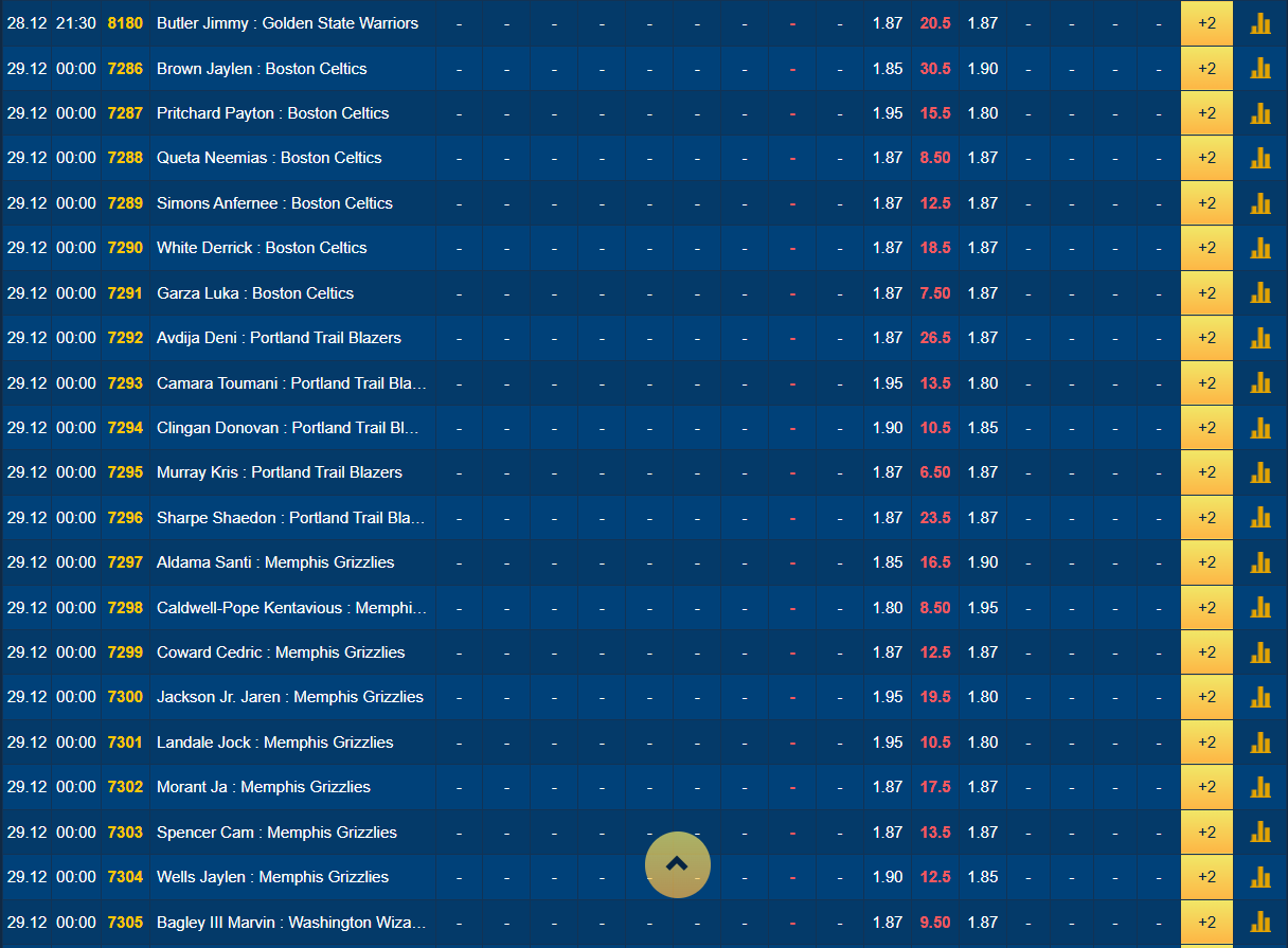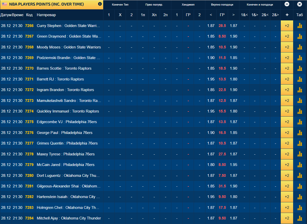 Во понудата за плус-минус поени има преку 55 играчи кои вечерва треба да излезат на НБА терените. Лука Дончиќ да биде во „плус“ треба да постигне преку 34,5 поени, Ленард Каваи е на 27,5 поени, Леброн Џејмс е на 23,5 поени, Стеф Кари е на граница од 28,5 поени, Брендон Инграм на 22,5 поени…
