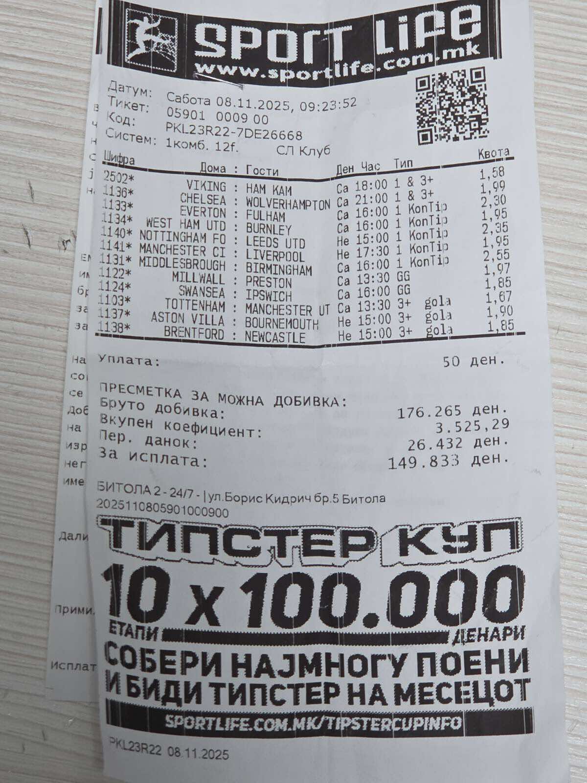По завршувањето на спортските викенд возбудувања, секогаш има голем број обложувачи кои задоволно ги тријат рацете од заработката на добитните тикети. Еден посебно интересен тикет кој беше уплатен во саботата е во Битола, каде што се погодени 12 комбинации, па само со 50 денари влог, добивката изнесува 149.833 денари.