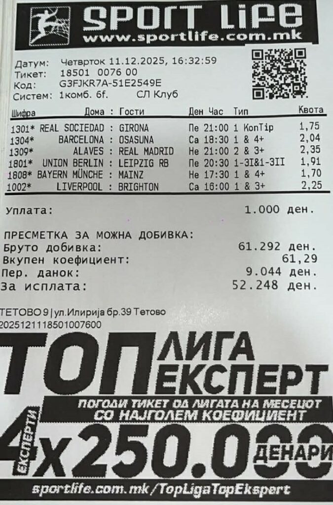 Ристе Јанков состави и хуманитарен тикет. Во најголем дел верува дека фаворитите ќе ја оправдаат улогата овој викенд на натпреварите низ Топ 5 лигите во Европа.