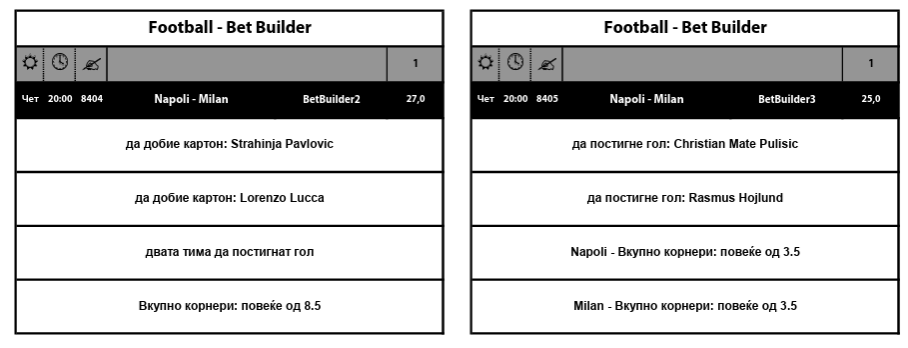Сите три предложени билдери за овој меч се со квоти поголеми од 20.0, а едната комбинација е посебно интересна бидејќи се бараат само три услови. За да биде добитна таа комбинација со коефициент од 23.0, треба во првото полувреме двата тима да добијат картон, да има барем пет корнери во првото полувреме и повеќе од 1,5 гол во тоа прво полувреме.