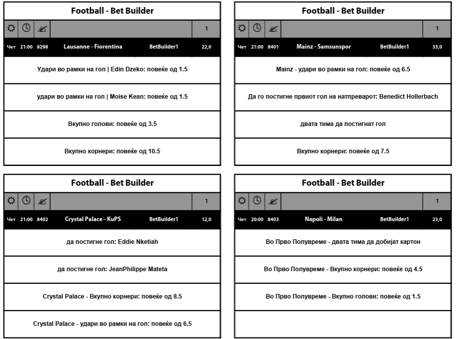 Сите три предложени билдери за овој меч се со квоти поголеми од 20.0, а едната комбинација е посебно интересна бидејќи се бараат само три услови. За да биде добитна таа комбинација со коефициент од 23.0, треба во првото полувреме двата тима да добијат картон, да има барем пет корнери во првото полувреме и повеќе од 1,5 гол во тоа прво полувреме.