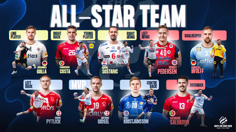 Европската ракометна федерација, ЕХФ, го објави идеалниот олстар тим на Европското првенство кое завршува денеска.