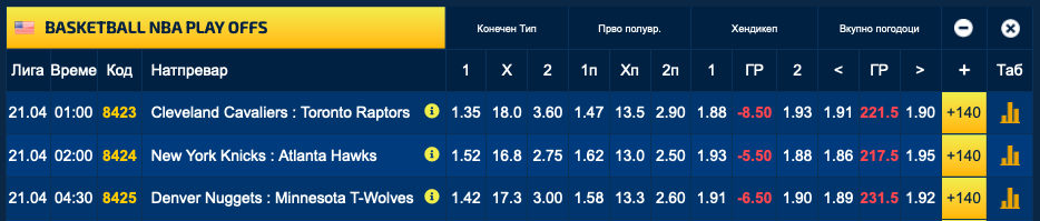 Победи се очекуваат од Кливленд (1.35), Њујорк (1.52) и од Денвер (1.42).