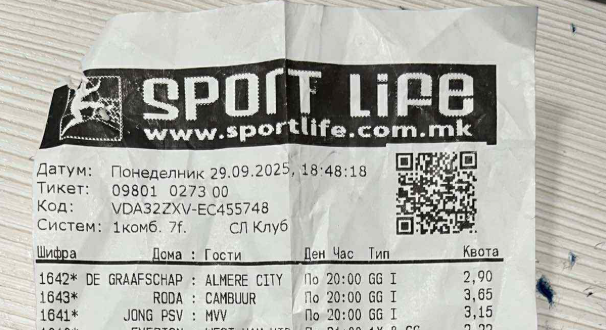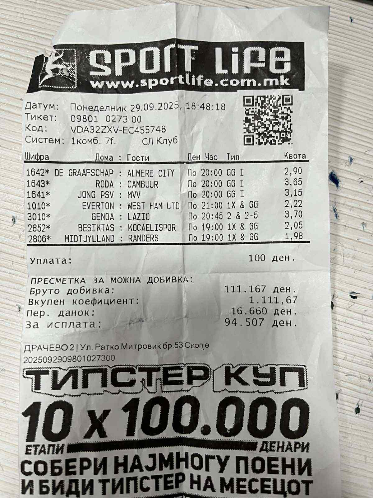 Комбинација од игри на голови и фиксови да се погоди победникот се покажа како перфектна на тикетот кој во понеделникот беше уплатен во скопско Драчево. На тикетот кој само со 100 денари влог стигна до нето-добивка од 94.507 денари имаше вкупен погоден коефициент од 1.111,67.