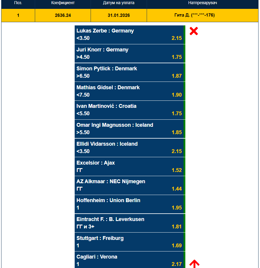 Гита имаше направено перфектен тикет со 13 погодени, од кои седум од ракометната понуда, додека останатите шест беа фудбалски дуели, а на крајот погоди вкупен коефициент од 2.636,24, најмногу од сите кои уплаќаа тикети што влегуваа во оваа акциска игра.