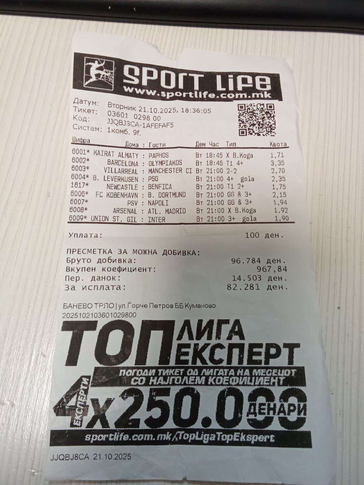 Тоа што Арсенал и Атлетико Мадрид играа 0:0 на полувреме е доволно да се погоди „било кога Х“, а Интер со 4:0 победи на гости кај Сент Унион, доволно за погоден 3+. Со 100 вложени денари, добивката е 82.281 денари.