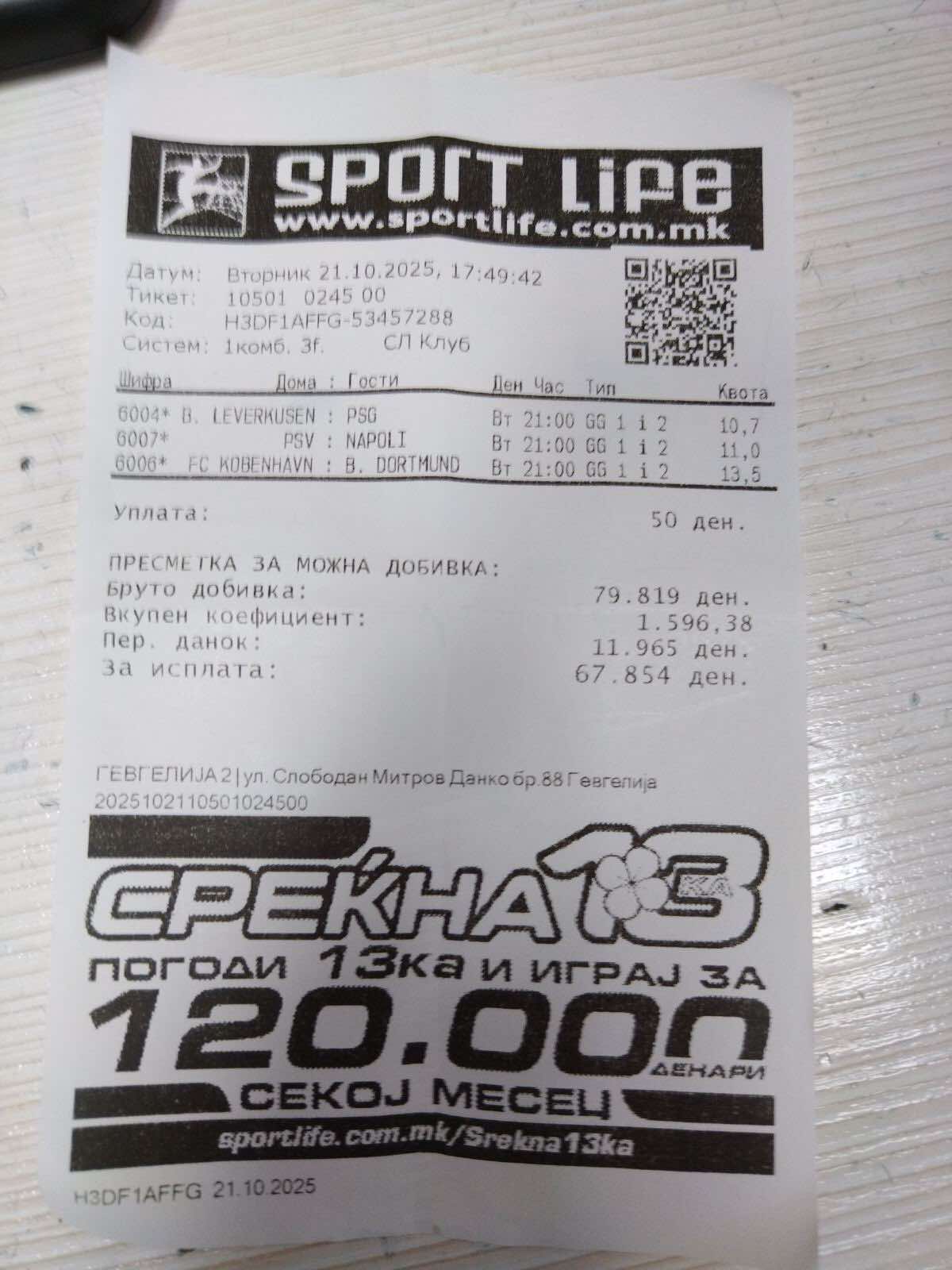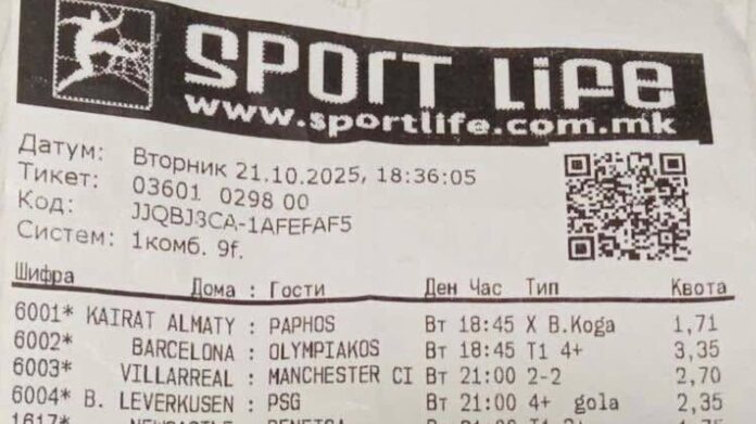 Во Гевгелија погоден е тикет со вкупна квота од 1.596 и тоа со само три натпревари, сите со коефициенти над 10. Сите три меча се одиграни на иста комбинација а тоа е да биде гол-гол во првото и гол-гол во второто полувреме.