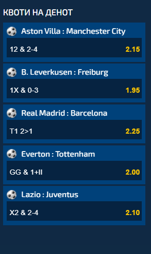 Првиот предлог е да одиграте дека мечот Астон Вила – Манчестер сити нема да заврши нерешено и притоа дека ќе има 2-4 гола, комбинација за која квотата е 2.15.