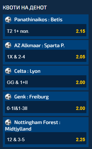 Пет меча од вечерните возбудувања во Лигата на Европа и Конференциската лига на УЕФА се дел од понудата во Квотите на денот, а доколку сите пет понудени комбинации ги одиграте на еден тикет, вкупниот коефициент кој ќе го добиете е 39.66.