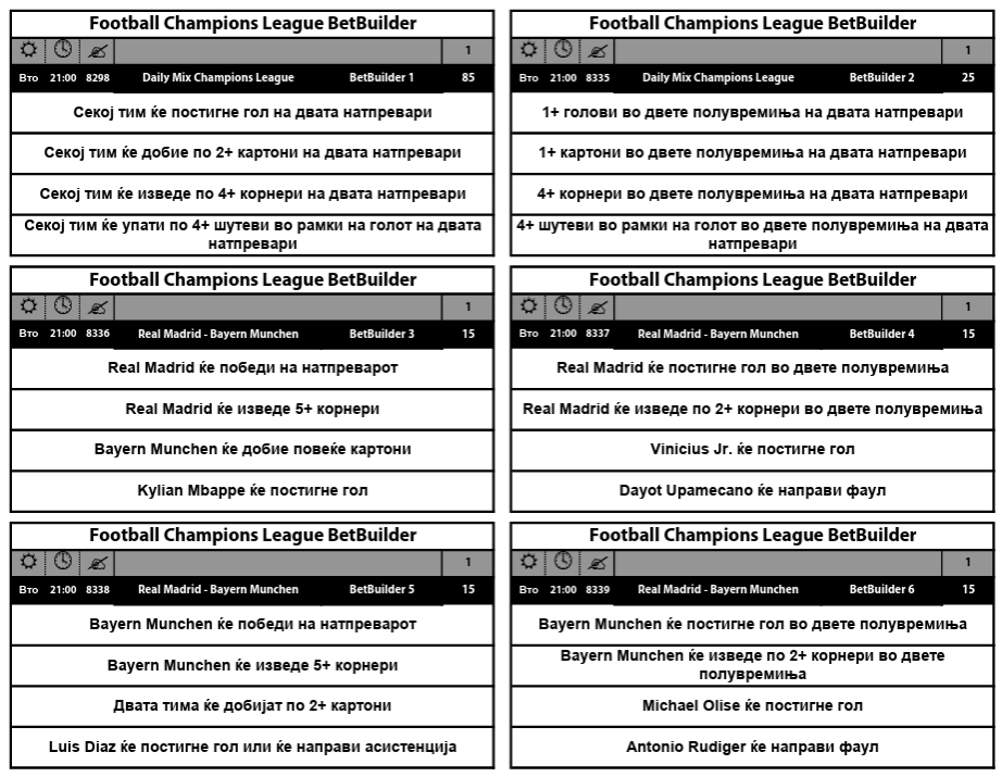 Десет Бет билдер комбинации се најдоа во денешната понуда на Sport Life, а сите се за двата меча од четвтфиналето на Лигата на шампионите.