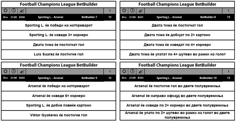Интересно е дека за секој од мечевите има по четири билдери и кај сите овие комбинации квотата е 15.0. Има билдери во кои се бара победа на секој од четирите тима, па кој и да е вашиот фаворит, ќе најдете нешто по ваш вкус.