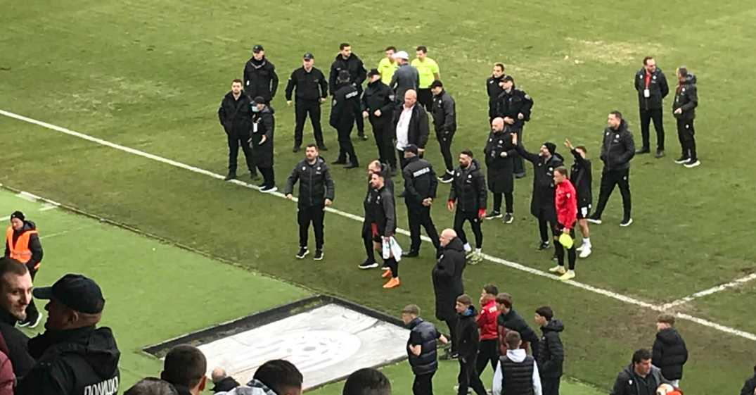 По завршувањето на натпреварот, надворешно лице влегло на теренот за игра и упатувало закани кон главниот судија и асистентот. Во тие моменти, дел од публиката започнала повторно да фрла предмети кон теренот, по што судискиот тим, кој веќе се упатил кон соблекувалните, бил принуден да се врати назад на теренот од безбедносни причини.