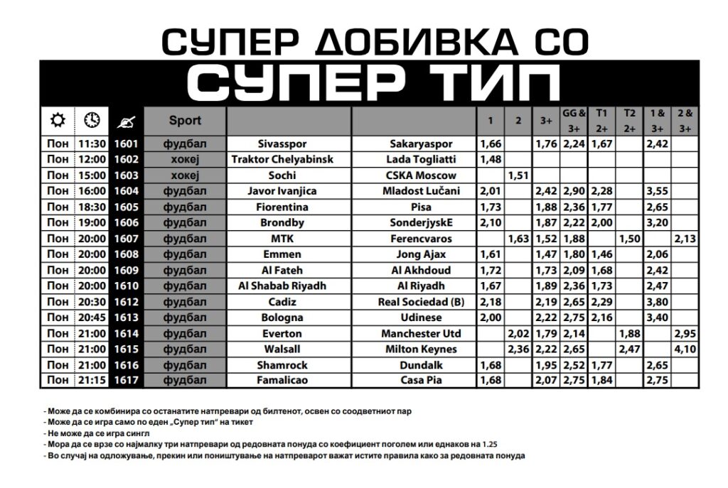 Така е и во Серија А и во Премиер лигата. Тука се Фиорентина, Манчестер јунајтед, но и Болоња, Ференцварош и многу други со максимално зголемени квоти во Супер типот.