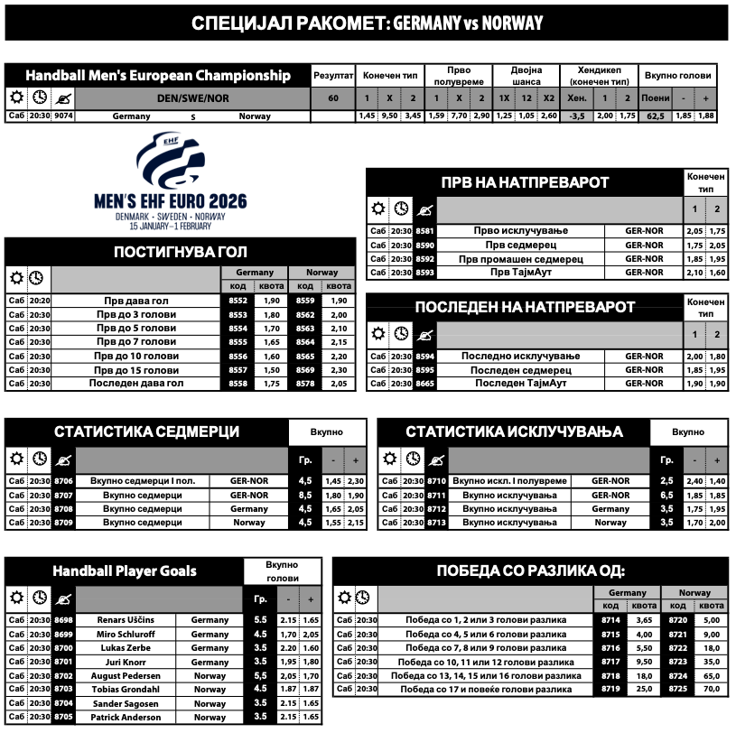 Денешната програма ја затвораат Германија и Норвешка, а токму Германците се фаворити со квота од 1.45.