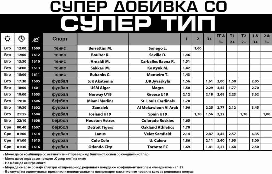 Денешниот Супер тип е примамлив и поради тоа што дури на 14 меча има специјално зголемени квоти за единици.
