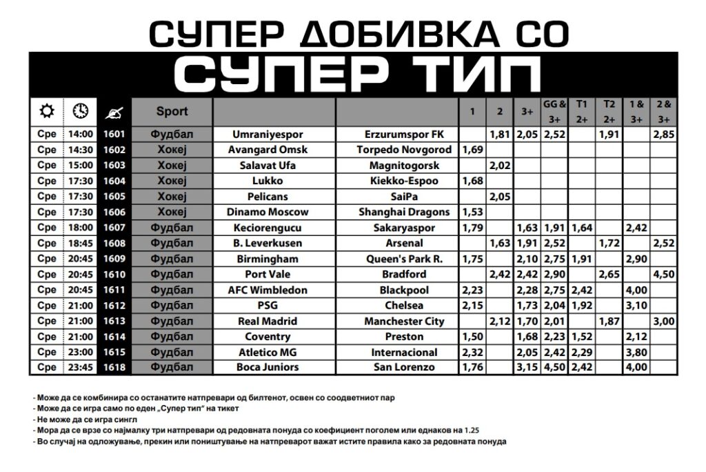 Фудбалот доминира, но има и хокеј со зголемени квоти во денешниот Супер тип на Sport Life.
