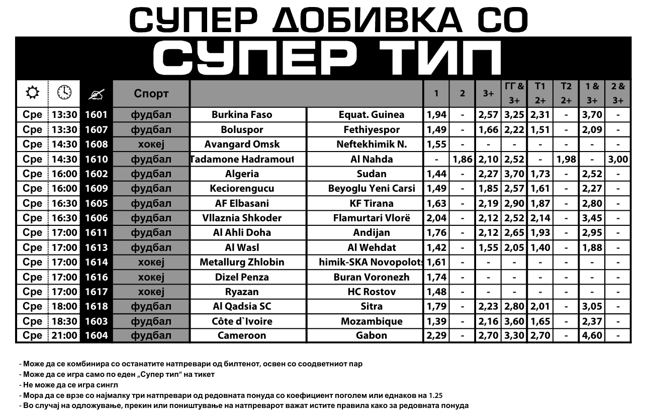 Натпревари само од два спорта се дел од понудата со зголемени квоти на Sport Life, Супер типот. Фудбалот е застапен со 12 натпревари, а хокејот со четири, што би значело дека во Супер типот за среда може да се најдат зголемени квоти на вкупно 64 игри.
