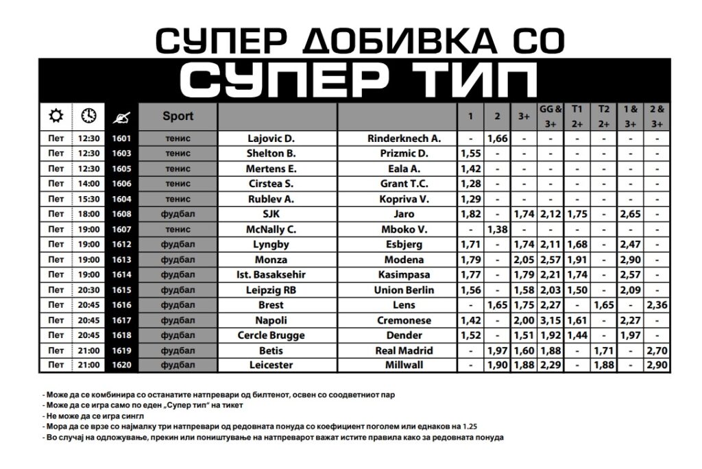 Денешниот Супер тип е микс од фудбал и од тенис. Фудбалските случувања доминираат, но има и завиден број тениски мечеви. Се разбира, сите 16 имаат максимално зголемени коефициенти.