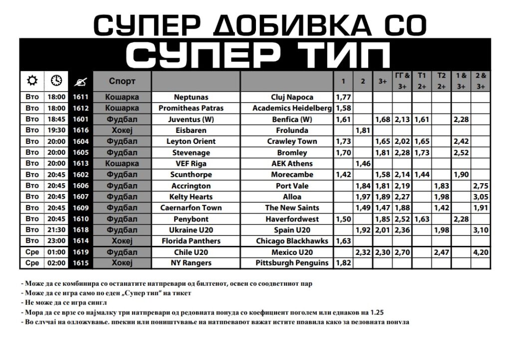 Разновидна е понудата во денешниот Супер тип. Фудбалот доминира, но има и кошарка и хокеј со значително зголемени квоти во понудата на 16-те избрани.