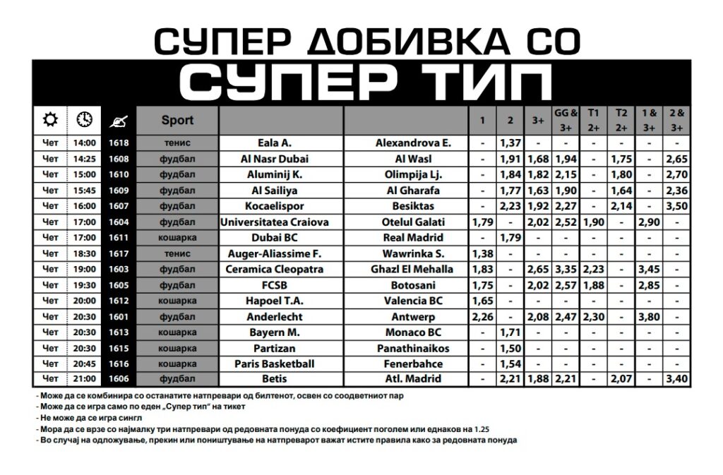Нови 16 предлози со одлични коефициенти се подготвени во денешниот Супер тип. Разновиден е, со оглед дека се вклучени мечеви од фудбалот, кошарката и тенисот.