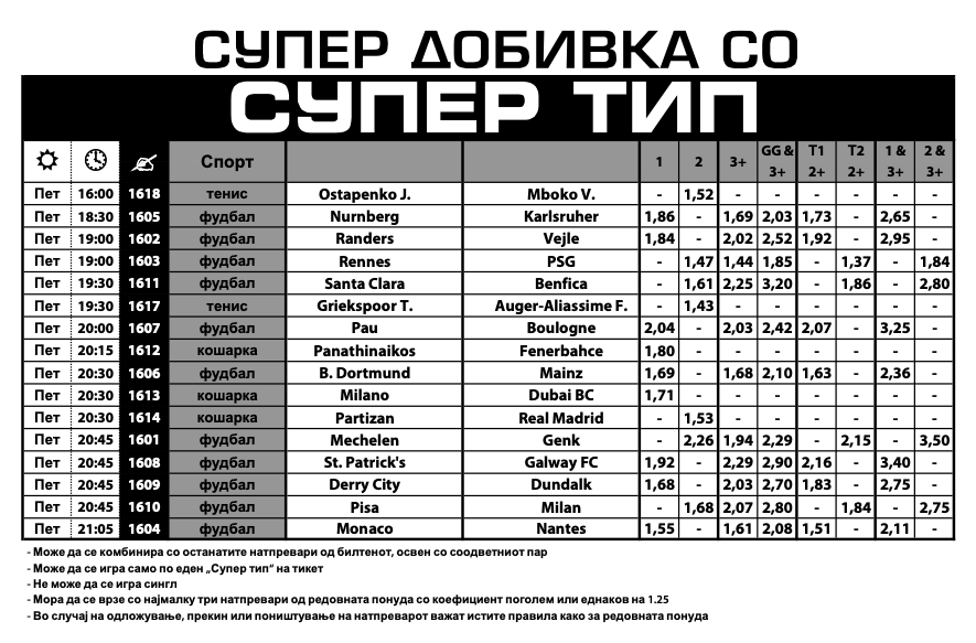 Во Супер типот за петок може да се најдат зголемени квоти на вкупно 60 игри.