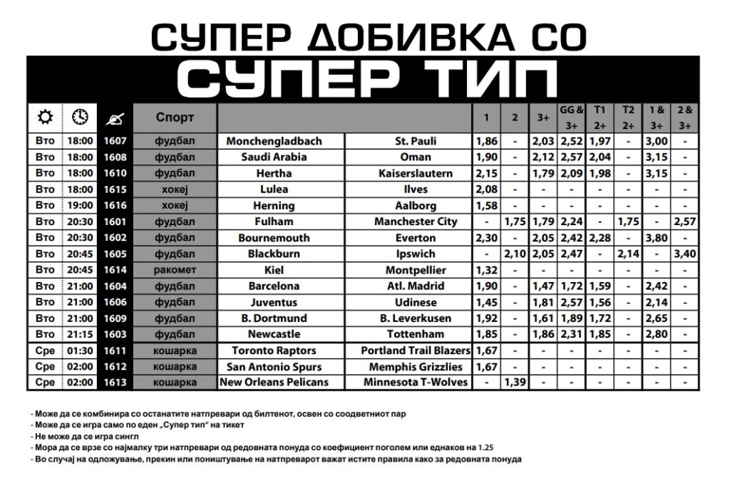 Разновидна е денешната понуда во Супер типот. Фудбалот доминира, но има натпревари и од кошарка, ракомет и хокеј. Се разбира, со максимално зголемени коефициенти.