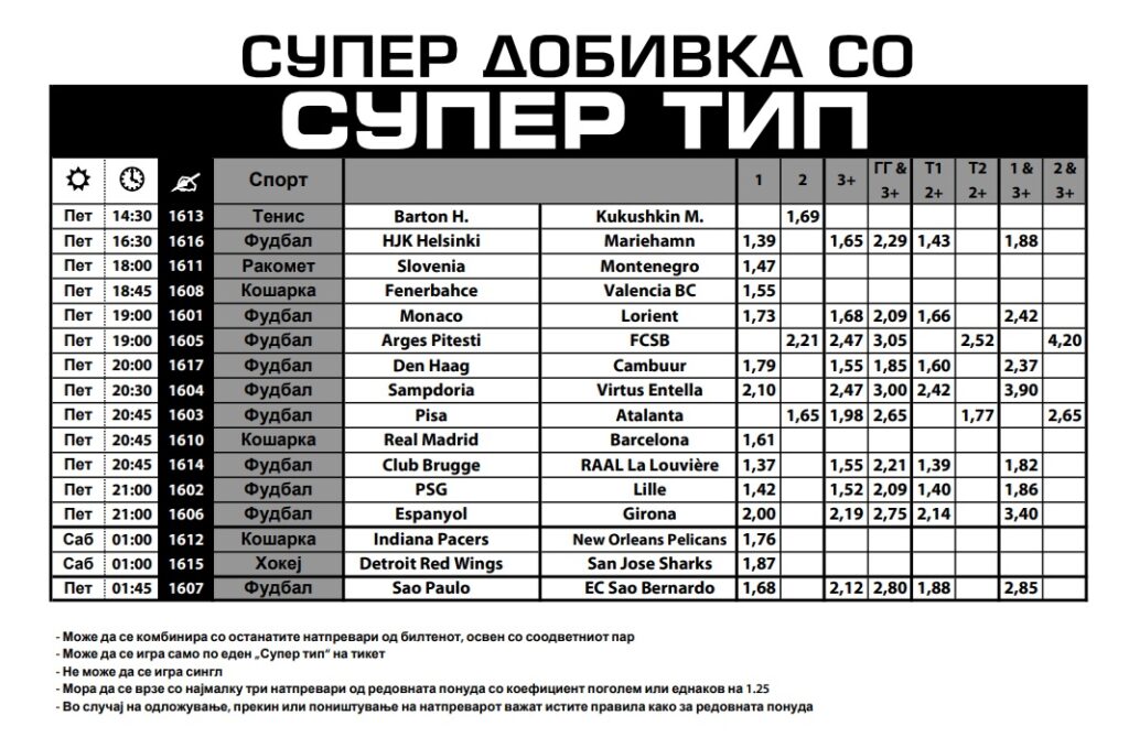 Денешниот Супер тип е максимално разновиден и со максимално зголемени квоти. Меѓу 16-те „избрани“ има понуда дури од пет спорта: фудбал, кошарка, ракомет, тенис и хокеј.