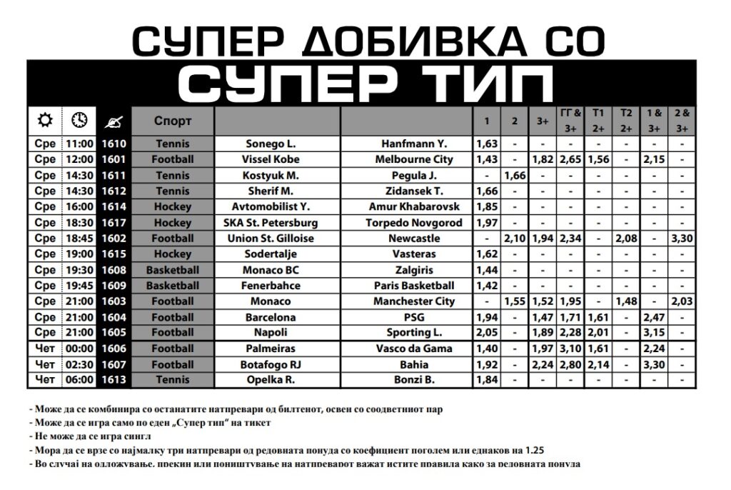 Оваа среда нуди разновиден Супер тип во Sport Life. Натпревари од четири спорта со максимално зголемени квоти. Изборот е од фудбал, кошарка, тенис и хокеј, а коефициентите се максимално големи.