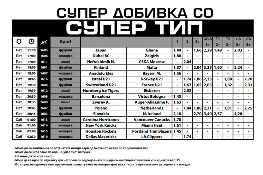 Разновидна е понудата во денешниот Супер тип. Фудбал, кошарка, тенис и хокеј со максимално зголемени квоти се наоѓаат меѓу „16-те избрани“.