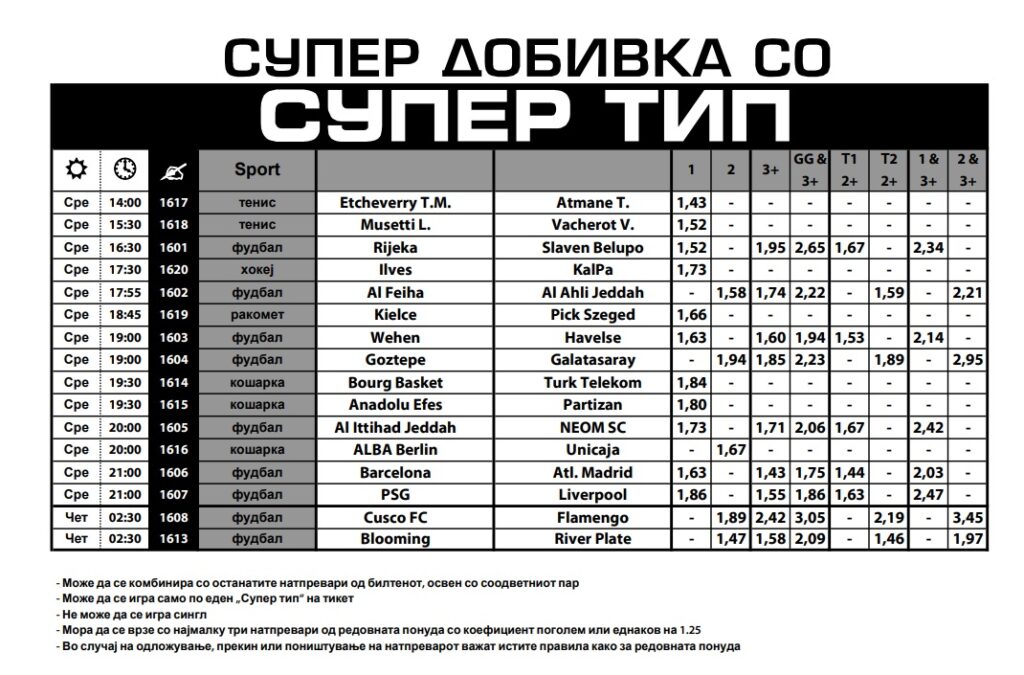 Денешниот Супер тип е максимално разновиден и со максимално зголемени коефициенти. Има од сѐ по нешто и за сите вкусови.