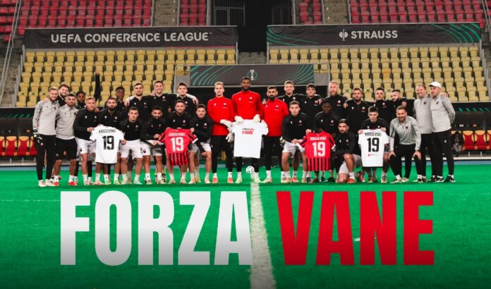 Фудбалерите на Шкендија и стручниот штаб на тетовскиот клуб, по одработениот официјален тренинг пред утрешниот дуел со Јагиелонија од Конференциската лига, се фотографираа во знак на поддршка за повредениот Ване Крстевски.