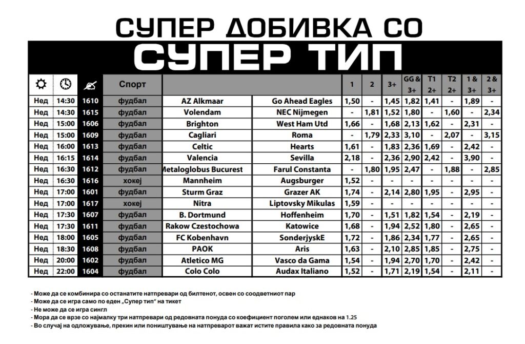Недела е ден за фудбал, но има и два натпревари од хокеј на мраз во денешниот Супер тип. Се разбира, сите 16 имаат максимално зголемени коефициенти.