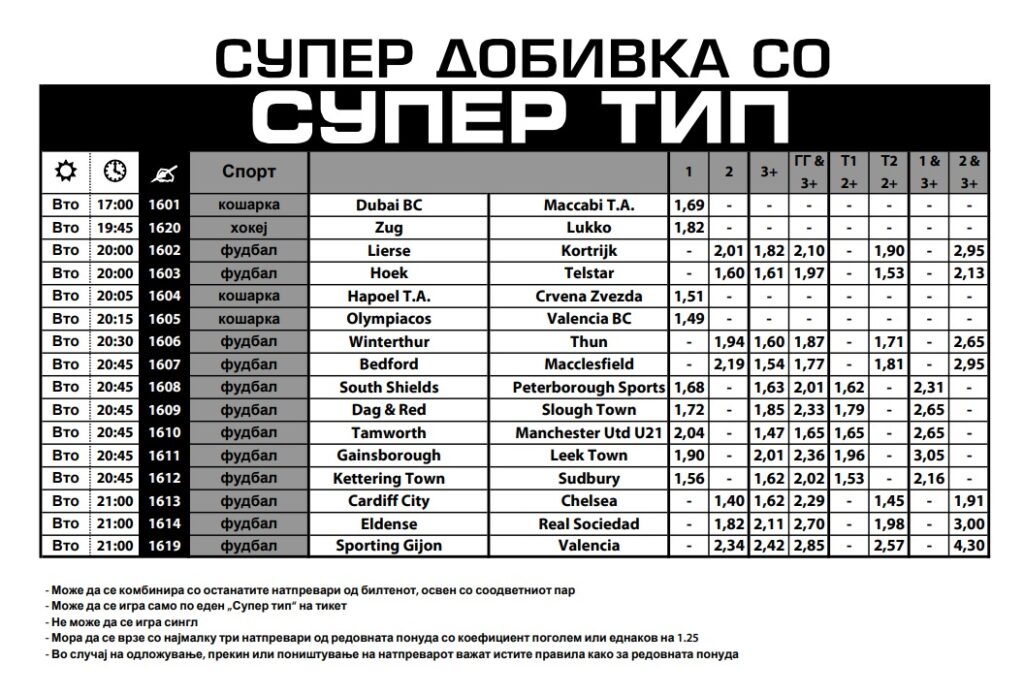 Зголемени се коефициентите на Дубаи, Зуг, Хапоел ТА, Олимпијакос, Челзи, Реал Сосиедад, Валенсија…