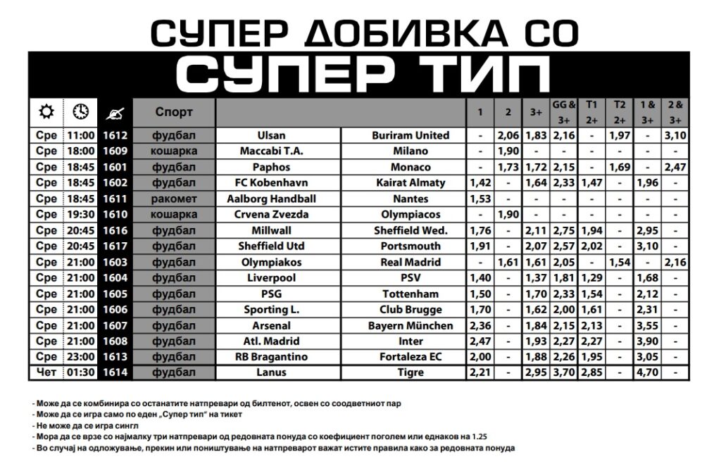 „Избраните 16“ стартуваат од 11 часот со фудбалскиот дуел меѓу Улсан и Бурирам, а потоа понудата продолжува од 18 часот со кошаркарскиот меч меѓу Макаби Тел Авив и Армани Милано.